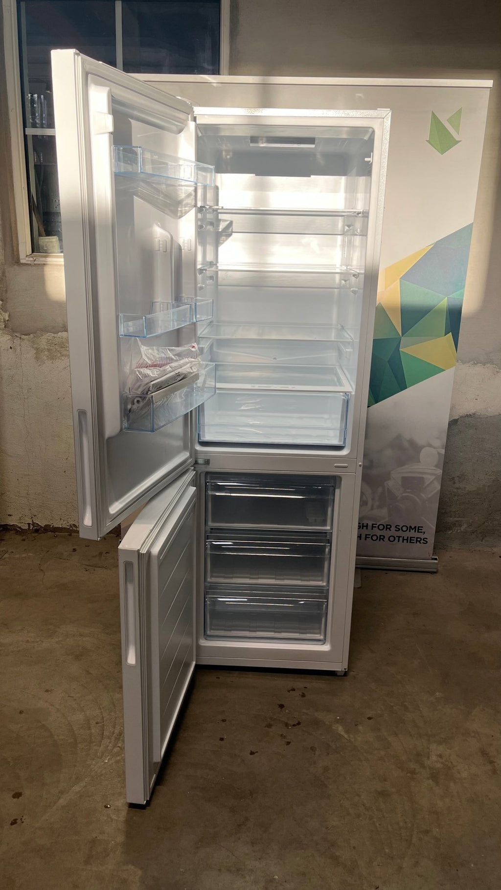 Kjøleskapet er designet med energisparende LED-belysning som gir en klar og god oversikt over innholdet. Den romslige, gjennomsiktige grønnsaksskuffen gir rikelig med plass til frukt og grønnsaker, og lar deg se hva som er i skuffen. Dette kan bidra til mindre matsvinn ved at du alltid har oversikt over hva du har.